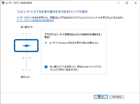2. ユーザーアカウント制御の設定]画面で、設定のスライダーを「アプリがコンピューターに変更を加えようとする場合のみ通知する(規定)」に変更し、[OK]をクリックします。