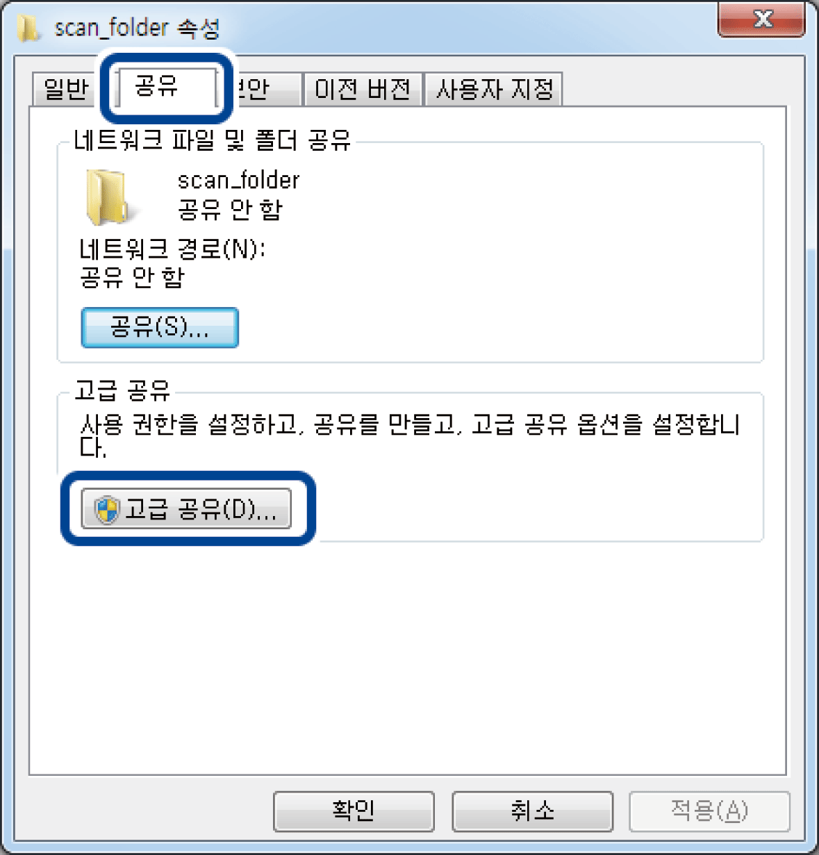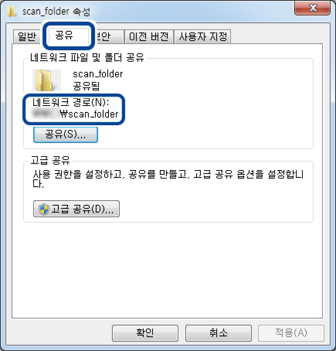 공유 폴더의 네트워크 경로가 표시됩니다. 이 경로는 스캐너의 연락처 등록에 사용됩니다. 메모 또는 복사해 두십시오.