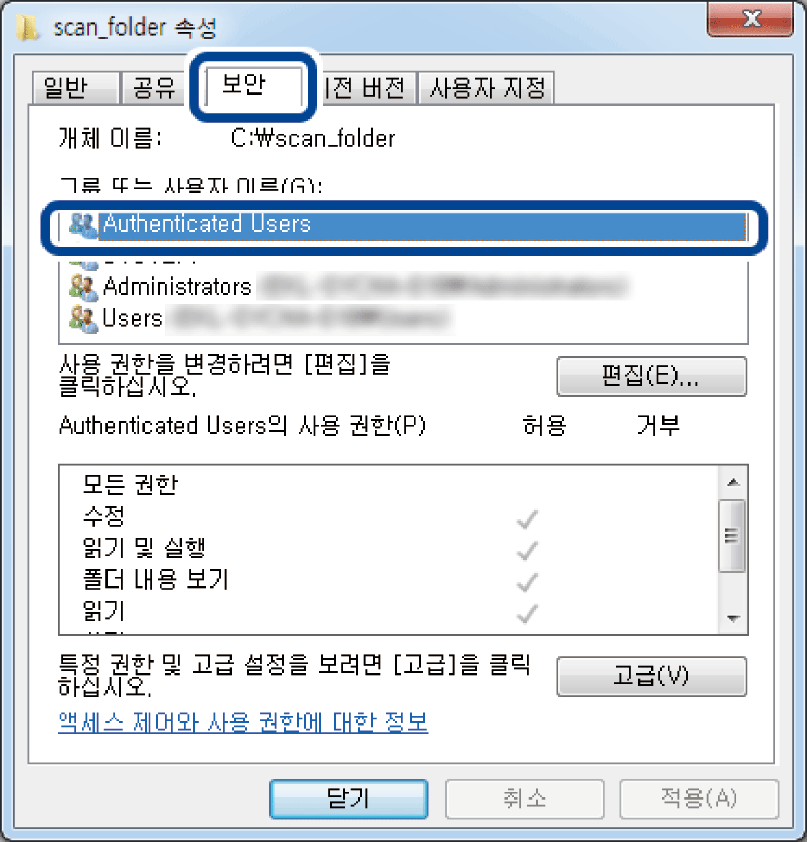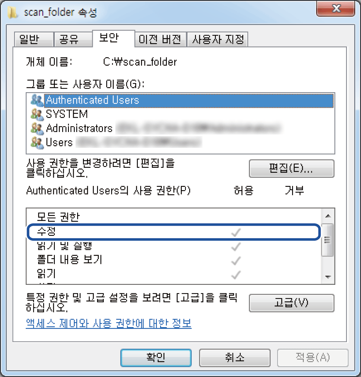 Authenticated Users의 사용 권한에서 수정 항목에 허용이 선택되어 있는지 확인하십시오.