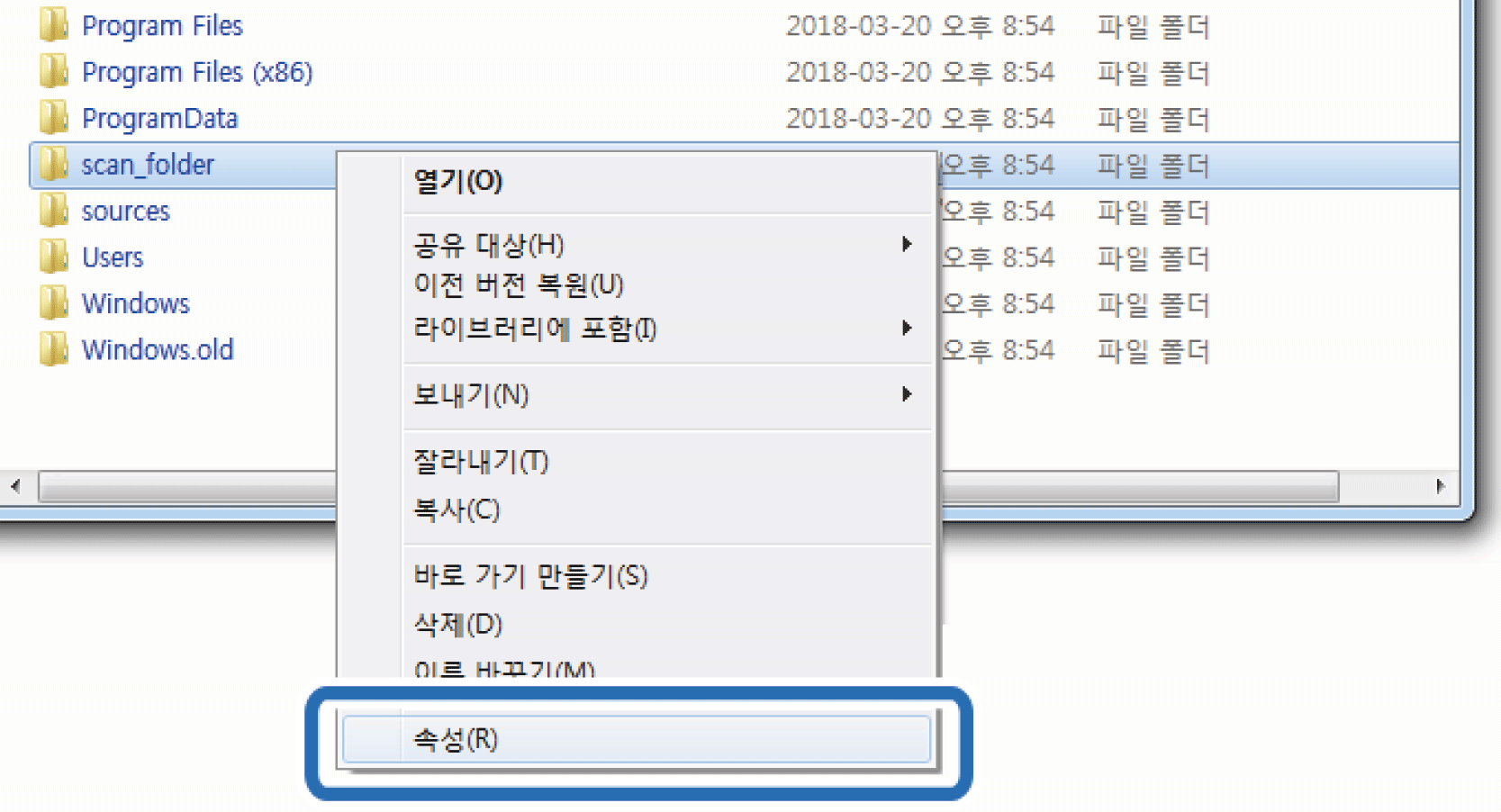 폴더를 마우스 오른쪽 버튼으로 클릭한 후 속성을 선택합니다.