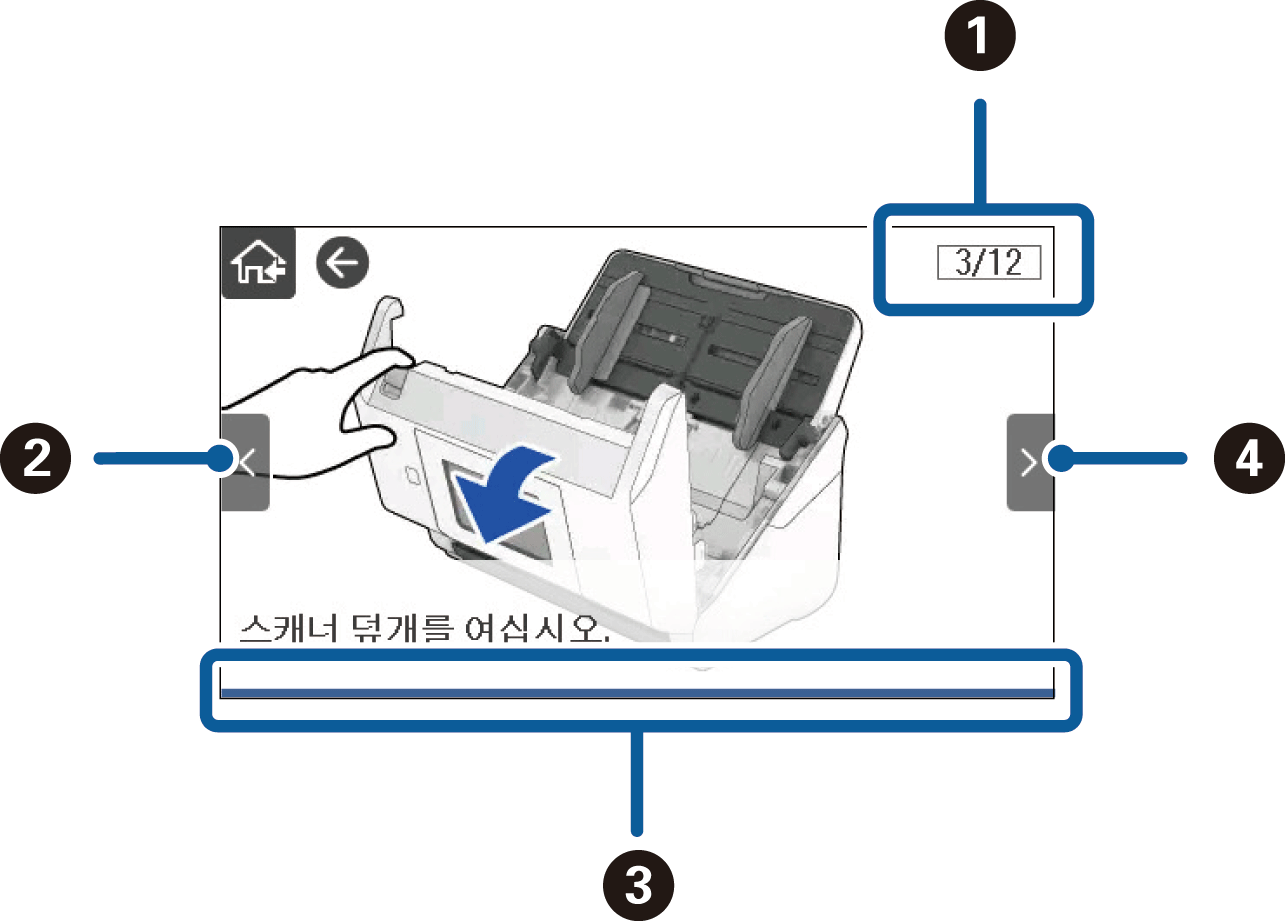 작동 화면 하단의 방법 선택: 상황에 맞는 애니메이션을 표시합니다. 애니메이션은 스캐너 모델에 따라 다릅니다.