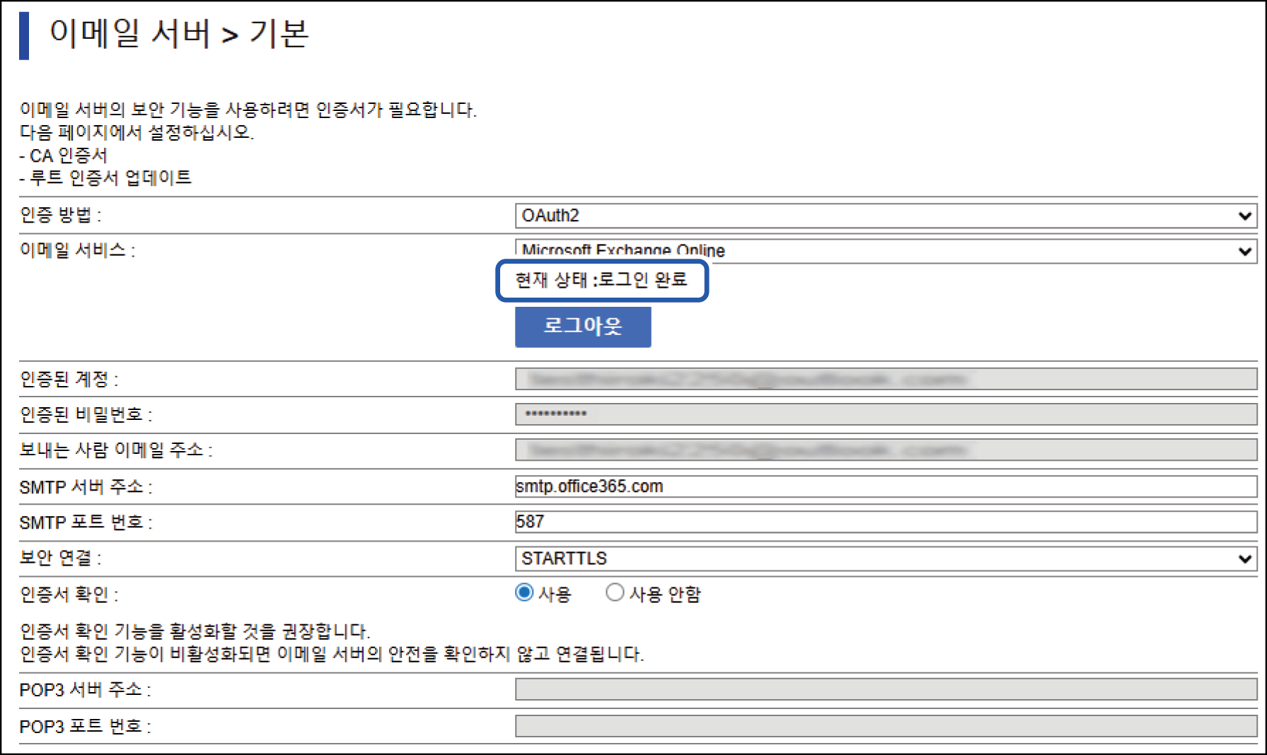 현재 상태가 로그인 됨인 경우 로그인 정보가 스캐너에 저장되지 않았을 수 있습니다. Ok(확인)을을 클릭하면 설정 정보가 스캐너로 전송됩니다.