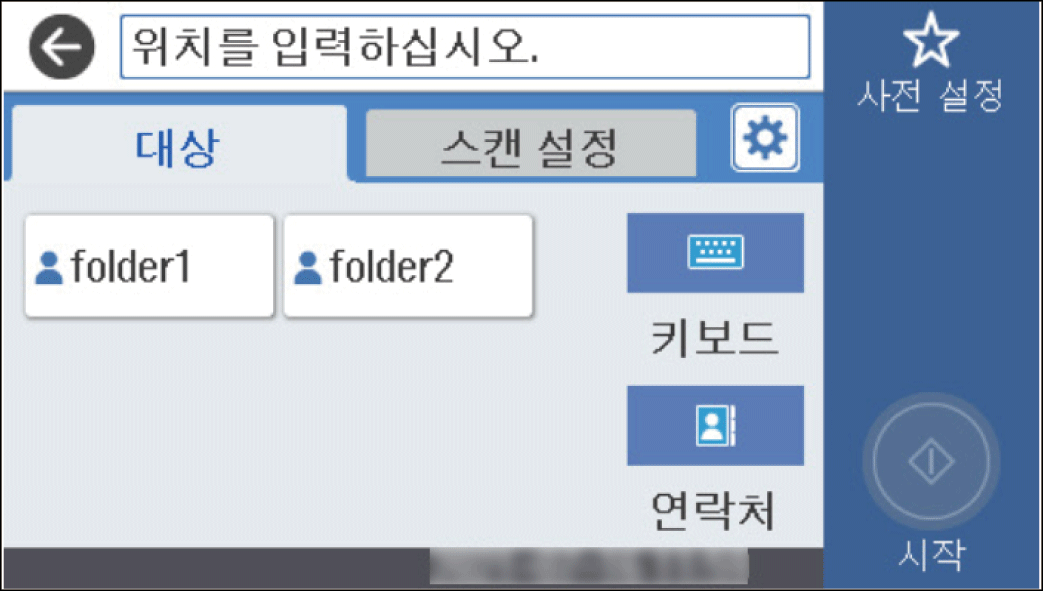 스캔한 이미지를 네트워크에 지정한 폴더에 저장할 수 있습니다. 폴더 경로를 직접 지정할 수 있으나, 미리 연락처 목록에 폴더 정보를 등록해두면 편리합니다.