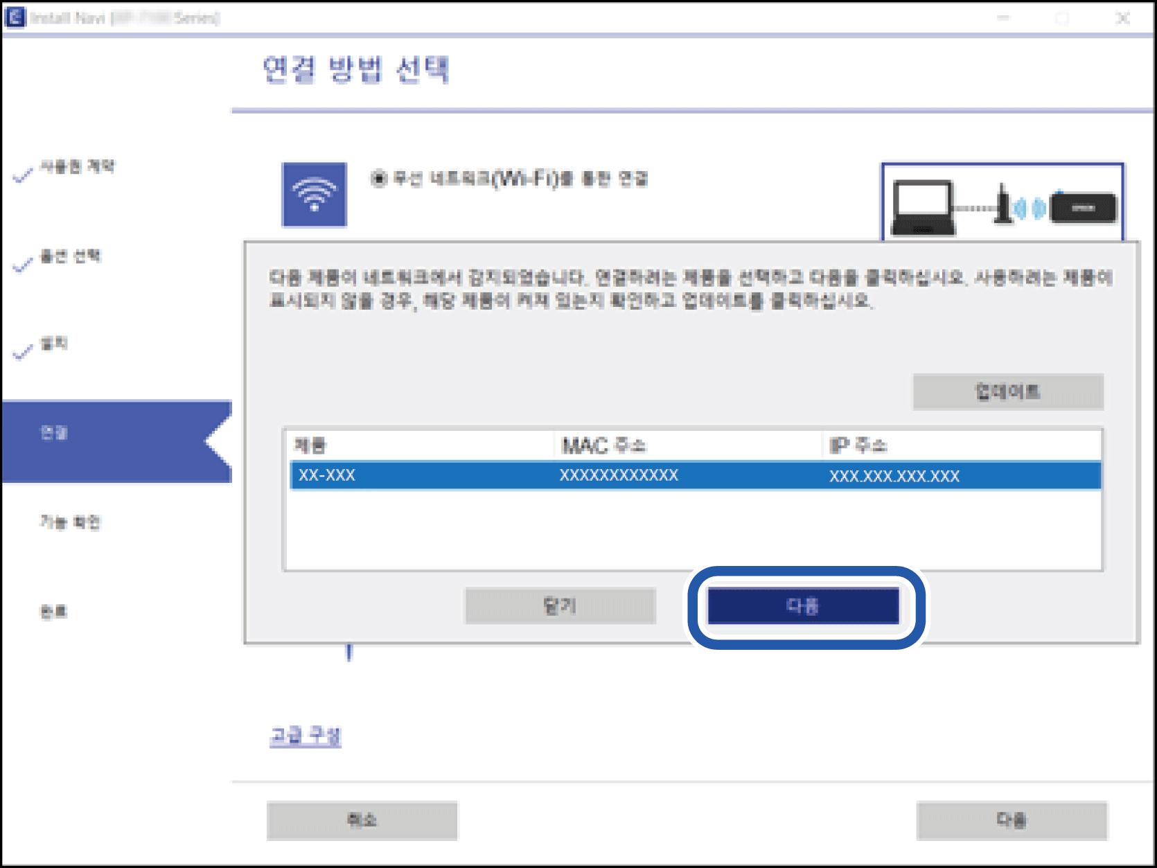 다음 화면이 표시될 때까지 화면 지침을 따르고 연결하려는 스캐너 이름을 선택한 후 다음을 클릭합니다.