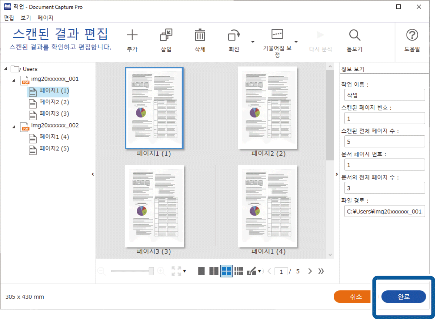 스캔 설정에서 저장 전 페이지 편집 대화상자 보기가 선택된 작업의 경우 스캔 후 스캔된 결과 편집 화면에서 스캔 결과를 확인한 다음 필요에 따라 편집하십시오.