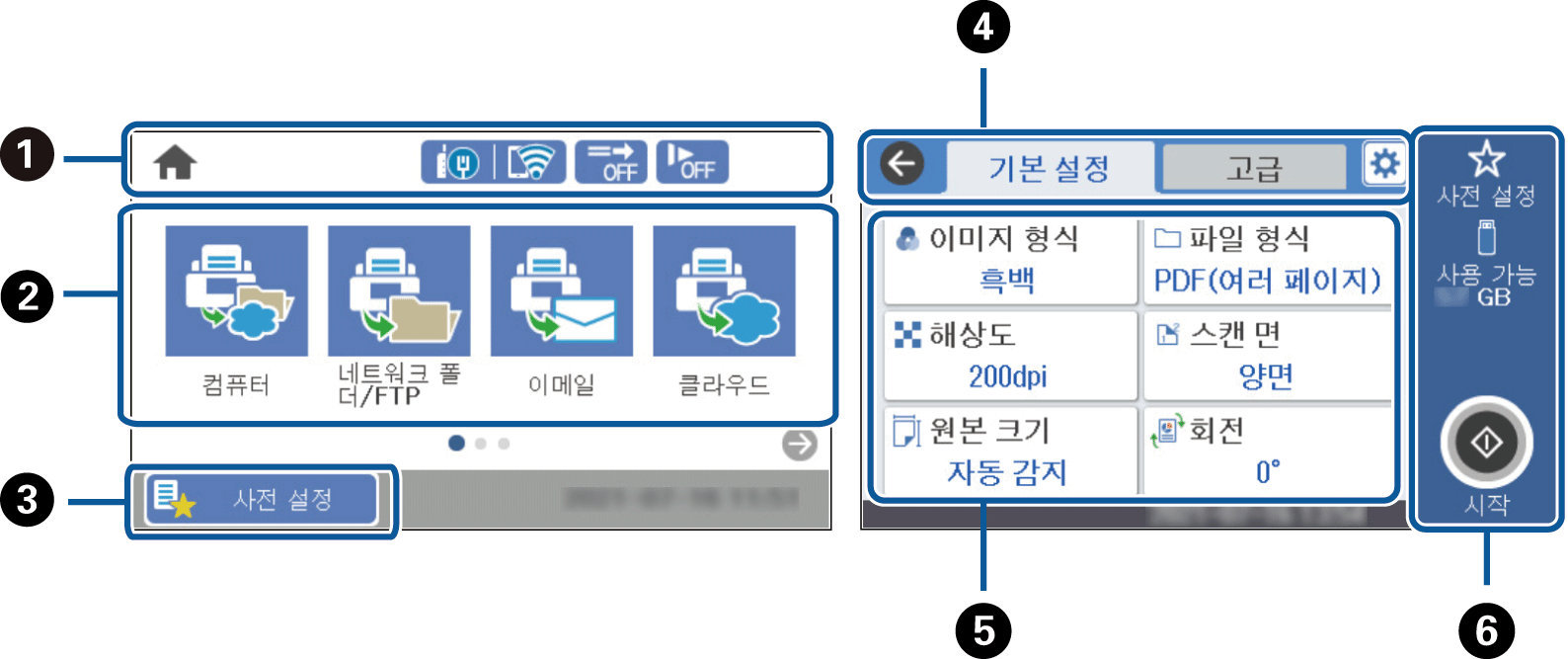 스캐너 상태를 아이콘으로 나타냅니다. 아이콘을 선택하여 현재 설정을 확인하거나 각 설정 메뉴에 액세스할 수 있습니다.