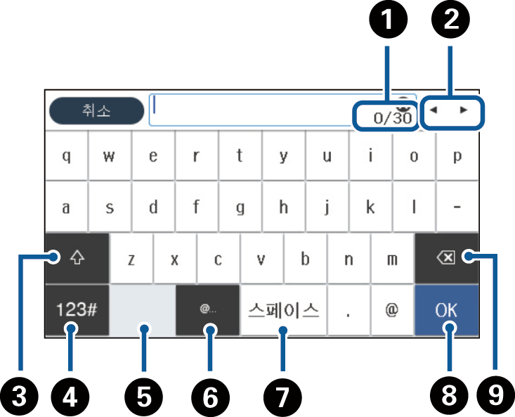 연락처 등록, 네트워크 설정 지정 등을 할 때 화상 키보드를 사용하여 문자와 기호를 입력할 수 있습니다.