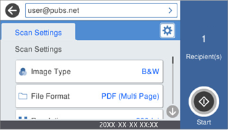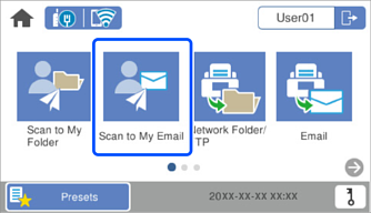 Velg Skann til min e-post på startskjermen til skannerens kontrollpanel.