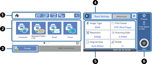Thể hiện trạng thái máy quét dưới dạng biểu tượng. Chọn biểu tượng để kiểm tra cài đặt hiện tại hoặc truy cập từng menu cài đặt. |