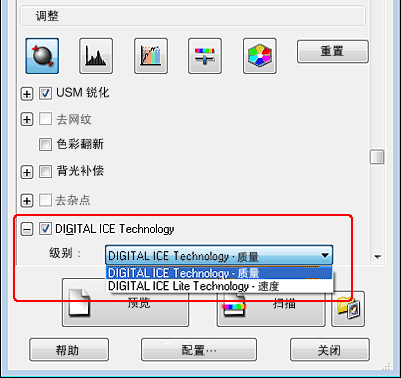 (Mac OS X)按钮旁边的选项,并在模式列表中选择 DIGITAL ICE Lite Technology - 速度设置。![]() 注释: