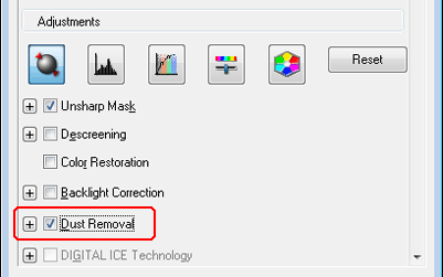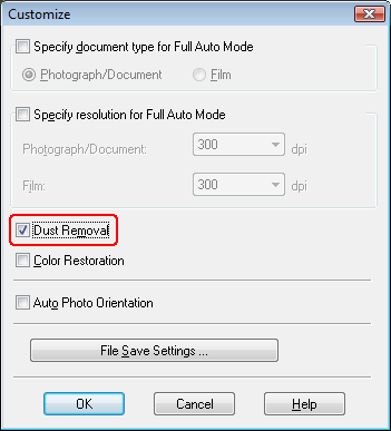 Odstranjevanje prašnih mest s funkcijo odstranjevanja prahuS funkcijo Dust Removal v Epson Scan lahko med optičnim branjem virtualno »očistite« prašne točke na originalnih fotografijah.