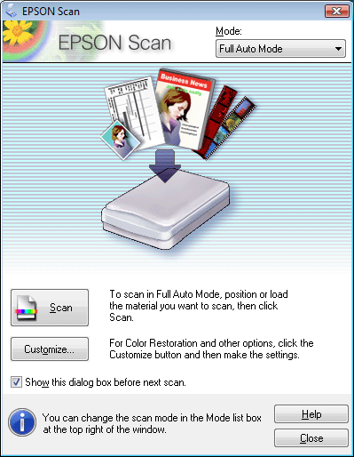 Optično branje v načinu delovanja Full Auto ModeOb prvem zagonu programa Epson Scan se ta zažene v načinu delovanja Full Auto Mode. Prikaže se okno Full Auto Mode.