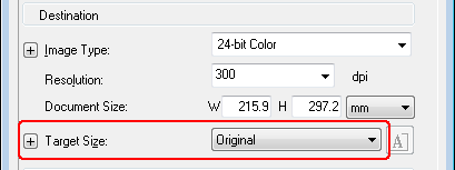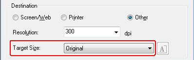 Če želite sliko optično prebrati na določeno velikost, po predogledu slike, vendar pred prilagajanjem območja za optično branje, ki ga določite z oznako, izberite nastavitev Target Size. S tem nastavite pravilno razmerje stranic območja optičnega branja in vaša slika ne bo nepričakovano obrezana.