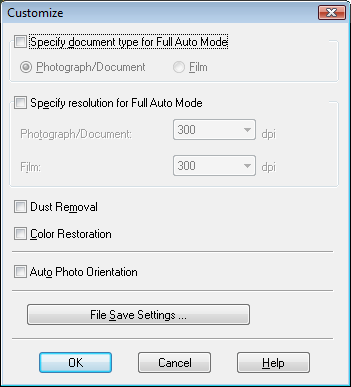 Kliknite potrditveno polje Specify resolution for Full Auto Mode in izberite število dpi (točk na palec) za optično branje.