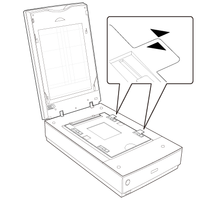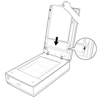 Odprite pokrov optičnega bralnika in nežno povlecite prekrivalo za dokumente navzgor ter ga odstranite. Prav tako odklenite transportno zaporo naprave za prosojnice.