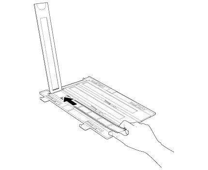 V 35 mm držalo diapozitivov namestite do dvanajst diapozitivov. Svetleča stran mora biti obrnjena navzdol. Vaša slika mora biti zrcalna na strani, ki je obrnjena navzgor, kot to prikazuje ilustracija držala za film. Vrh vaših slik mora biti usmerjen proti odprtemu delu držala filma, kot je prikazano spodaj.