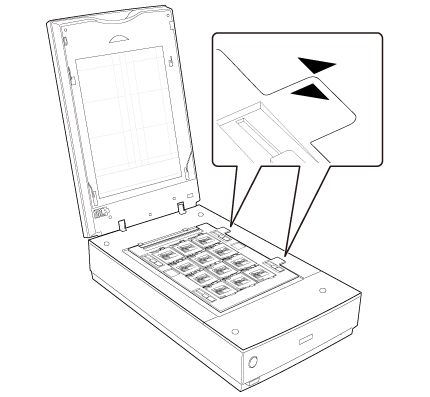 Držalo filma namestite na ploščo za dokumente tako, da bo poravnano z zgornjim desnim vogalom. Poravnajte simbol  na robu držala filma s simbolom  na robu plošče za dokumente.