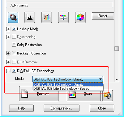 Derulaţi în jos până la zona Adjustments (Ajustări) şi bifaţi caseta de selectare DIGITAL ICE Technology.