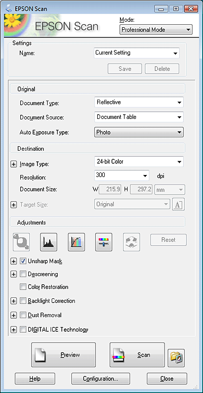 Nuskaitymas režimu Professional Mode („Professional“ režimas)Kai pasirenkate Professional Mode („Professional“ režimas), matysite „Epson Scan“ langą Professional Mode („Professional“ režimas).