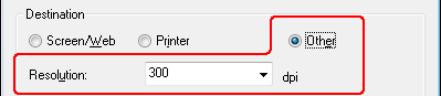 Norėdami pakeisti skiriamąją gebą, visų pirma pasirinkite Other (Kita) kaip Destination (Paskirtis) nustatymą.