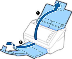 排出された原稿がきちんと積み重なるように、排紙トレイと拡張排紙トレイを原稿の長さより多少長めに引き出して、ストッパーを起こしてください。