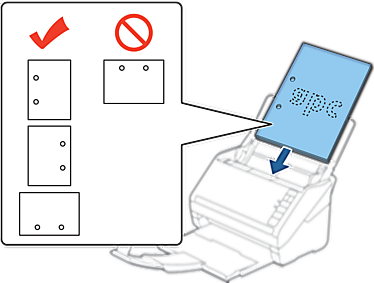 ルーズリーフ用紙などのパンチ穴のある原稿は、穴の位置が左右か下側になるようにセットします。原稿幅の中心から左右15mmの範囲(30mm幅)に、穴がないようにセットしてください。ただし、原稿の先端から30mmの範囲に穴があっても構いません。パンチ穴の周りにバリや反りがないことを確認してください。