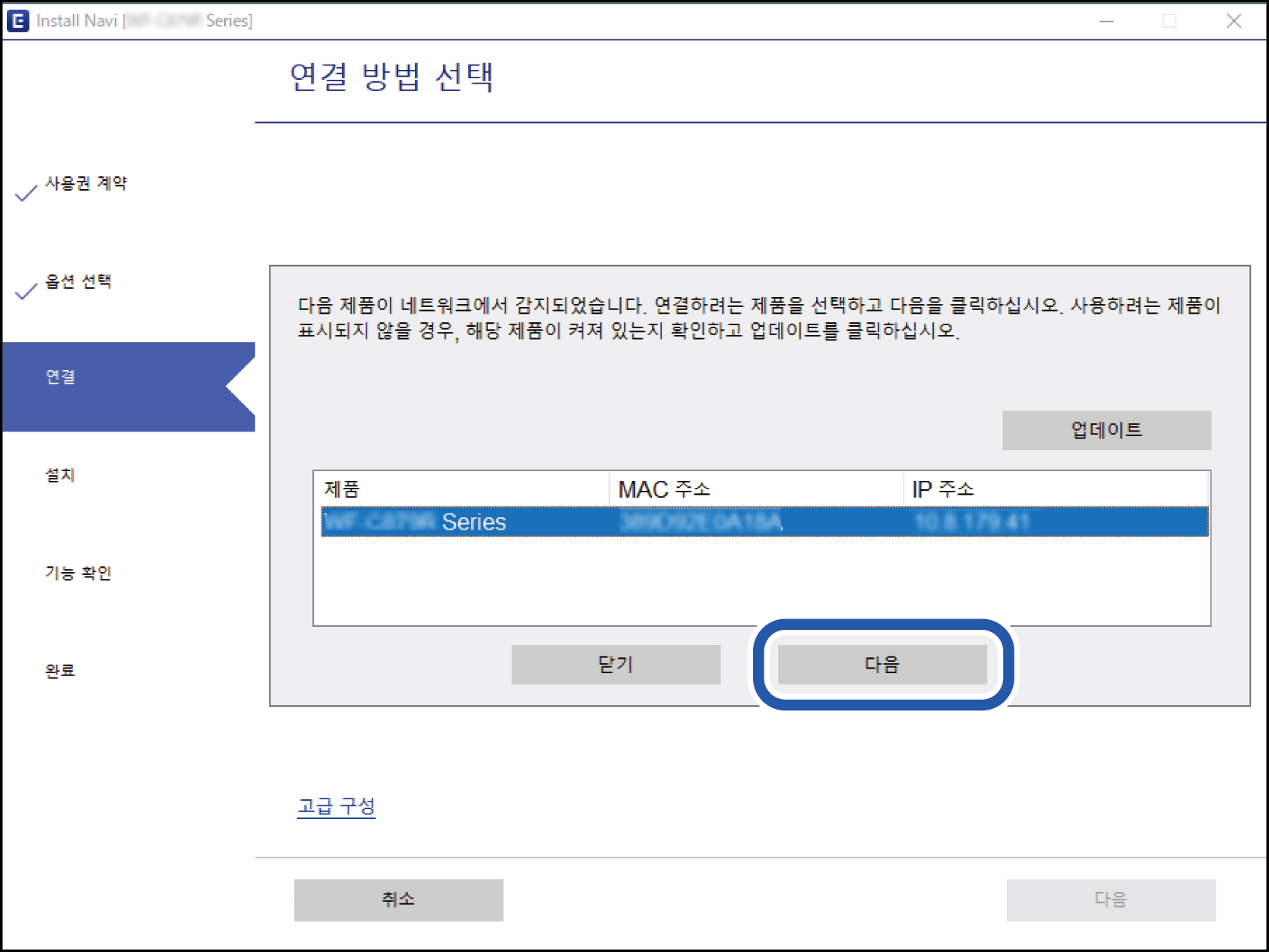 다음 화면이 표시될 때까지 화면 지침을 따르고 연결하려는 스캐너 이름을 선택한 후 다음을 클릭합니다.