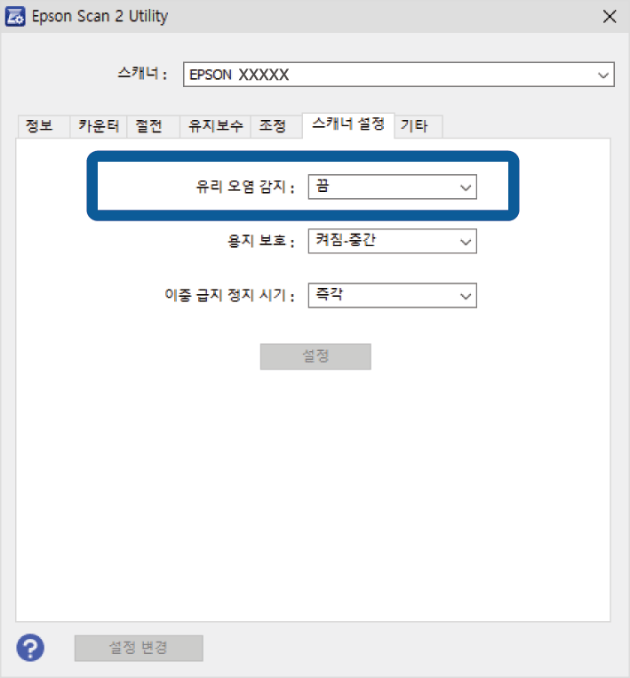 유리 오염 감지가 켬으로 설정되면 스캐너는 스캐너 내부 유리 표면의 얼룩을 감지하고 컴퓨터 화면에 알림을 표시합니다.