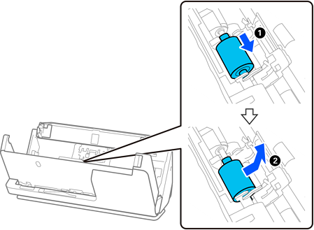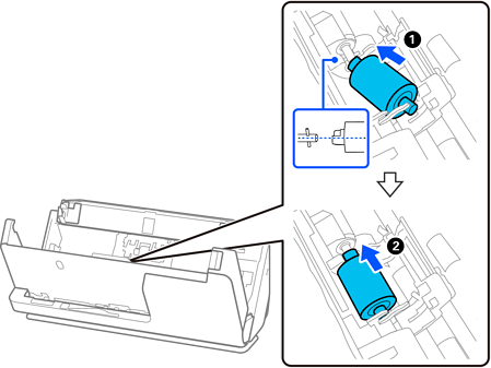 그림과 같이 새 픽업 롤러를 부착합니다. 픽업 롤러 끝의 오목한 부분을 스캐너의 축에 삽입하고 픽업 롤러를 내린 다음 뒤쪽으로 밉니다.