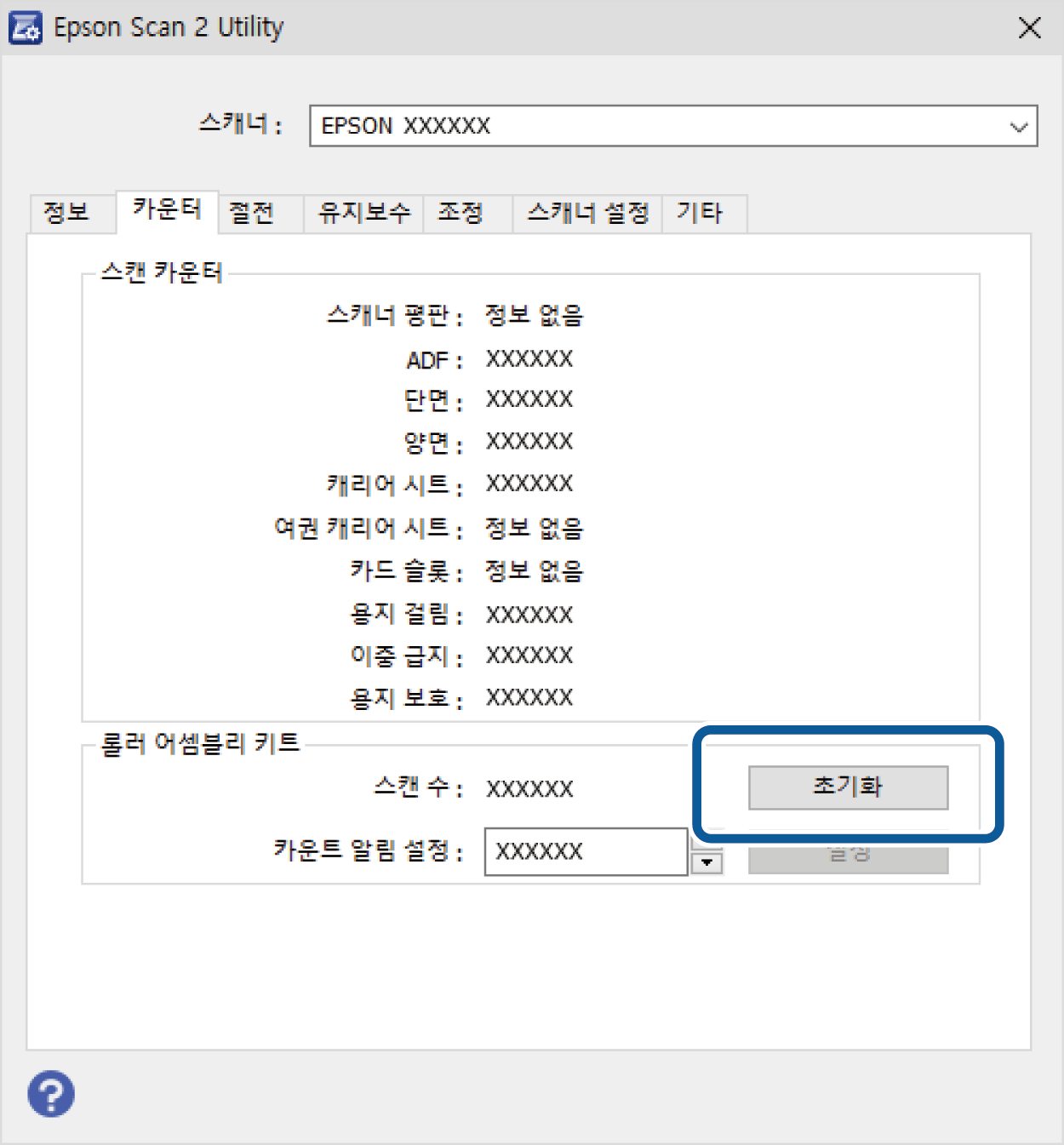 롤러 어셈블리 키트를 교체한 후 Epson Scan 2 Utility를 사용하여 스캔 수를 재설정합니다.