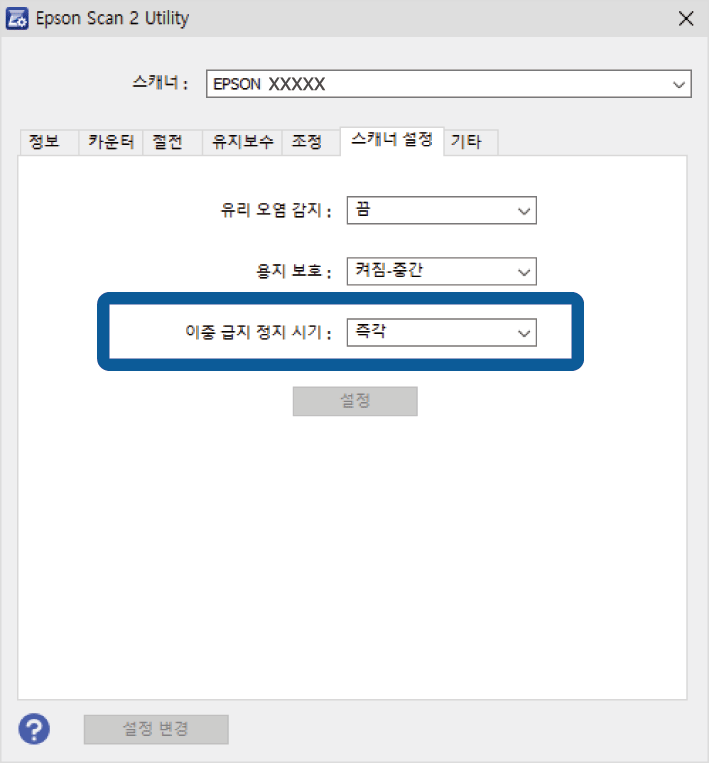 배출 후: 이중 급지가 감지된 문서는 그대로 스캔하지만 다음 문서의 스캔은 중지됩니다.