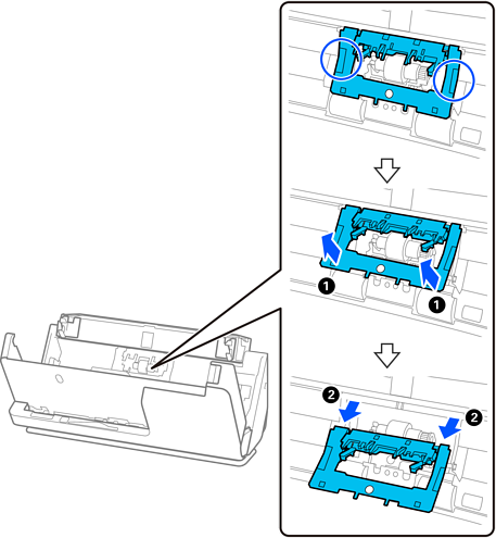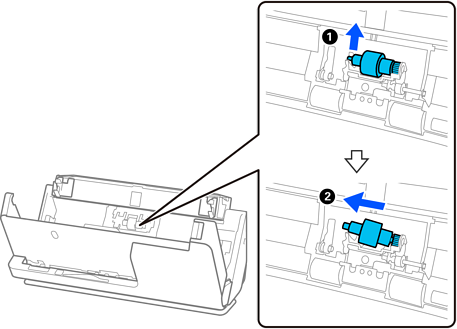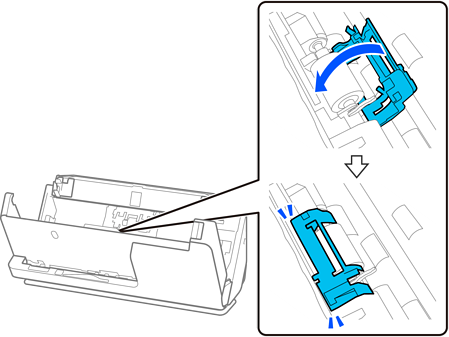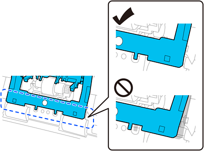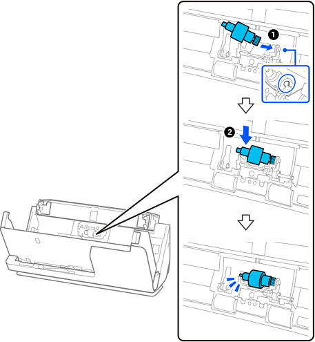 如图所示,安装新的取纸滚轮。将取纸滚轮末端的凹口插入扫描仪轮轴上,放下取纸滚轮,然后按以下图示方向滑动。