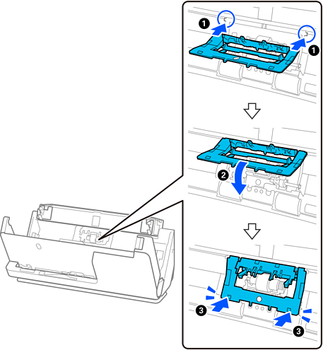 如图所示,安装新的分纸滚轮。将分纸滚轮的轮轴插入右侧孔中,然后放下分纸滚轮。