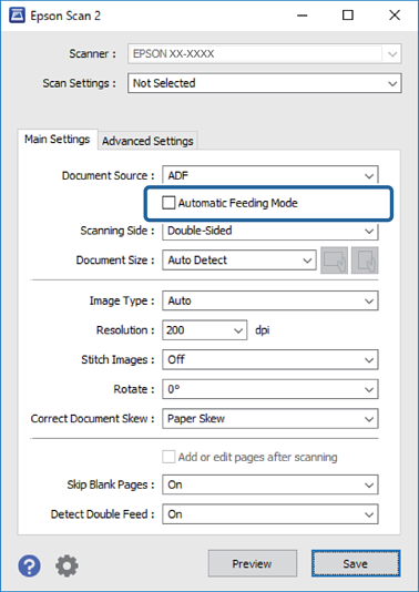 Ayarlar öğesini (Belge Kaynağı listesinde) seçerek Belge Kaynağı Ayarları penceresini açın. Görüntülenen ekranda Otomatik Besleme Modu Zaman Aşımı (saniyeler) öğesini ayarlayın.