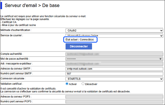 Si le État actuel est Connecté(e), il se peut que les informations de connexion n’aient pas été sauvegardées dans le scanner. Cliquez sur OK pour envoyer les informations de configuration vers le scanner.