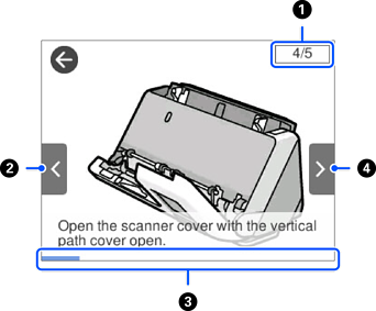 Valdymo skydelio ekrane galite peržiūrėti animacijas, kaip atlikti tokius veiksmus, kaip originalų padėjimas ir techninės priežiūros atlikimas.