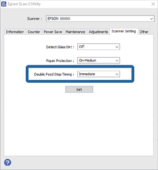 Wanneer u het bedieningspaneel gebruikt, tikt u op Instel. > Scannerinstellingen > Stoptiming voor dubbele toevoer om de stoptijd in te stellen.