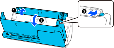 Abra o tabuleiro de entrada e puxe a alavanca para abrir a tampa do scanner.