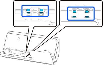 Limpe os rolos (4 pontos) e os rolos de plástico (4 pontos). Limpe-os com um pano macio isento de pêlos humedecido com uma pequena quantidade de produto de limpeza apropriado ou água.