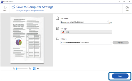 Detta program tillåter dig att skanna dokument och sedan spara de skannade bilderna med några enkla steg. Se hjälpen i Epson ScanSmart för information om hur applikationen används. Det här avsnittet förklarar hur man skannar och sparar som en PDF-fil som en grundläggande steg.