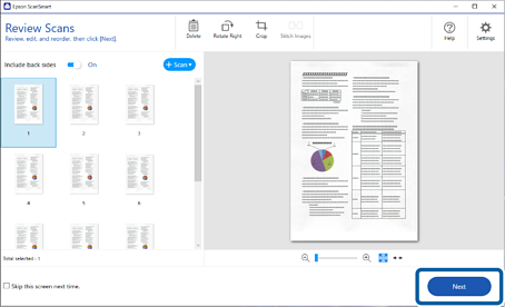 Om du inte vill kontrollera skannade bilder varje gång, kan du välja Hoppa över den här skärmen nästa gång..