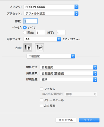 macOS Catalina (10.15)以降、macOS High Sierra (10.13)、macOS Sierra (10.12)、OS X El Capitan (10.11)、OS X Yosemite (10.10)、OS X Mavericks (10.9)、OS X Mountain Lion (10.8)で[印刷設定]メニューが表示されないときは、エプソンのプリンタードライバーが設定できていません。以下の方法で設定してください。