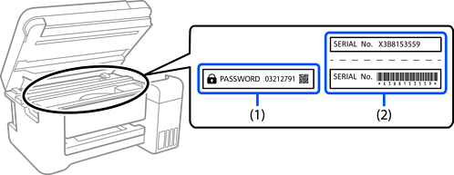 مقدار پیش فرض رمز عبور سرپرست مانند تصویر زیر، روی برچسب دستگاه چاپ شده است. محل اتصال برچسب به دستگاه بستگی دارد، مثلاً کنار محل باز شدن درپوشش، قسمت پشت یا بالای دستگاه.