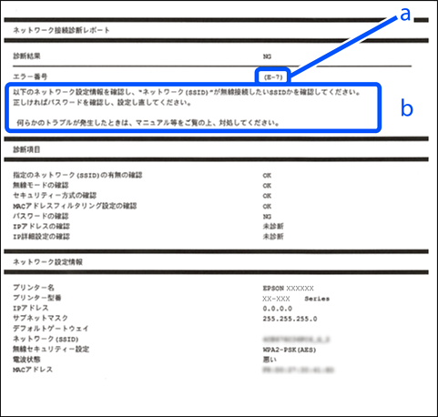 ネットワーク接続診断レポートのメッセージとエラー番号を確認して対処してください。