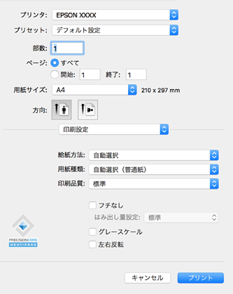 macOS Catalina (10.15)以降、macOS High Sierra (10.13)、macOS Sierra (10.12)、OS X El Capitan (10.11)、OS X Yosemite (10.10)、OS X Mavericks (10.9)、OS X Mountain Lion (10.8)で[印刷設定]メニューが表示されないときは、エプソンのプリンタードライバーが設定できていません。以下の方法で設定してください。