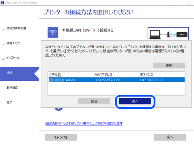 以下の画面が表示されるまで、画面の指示に従って操作し、接続したいプリンターを選択して[次へ]をクリックします。
