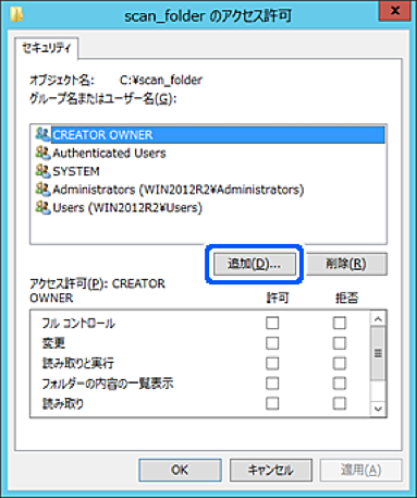 [グループ名またはユーザー名]の下の[追加]をクリックします。