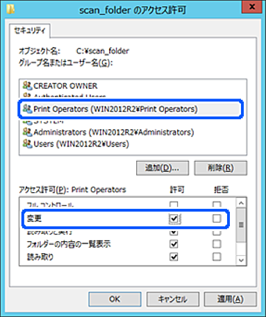アクセス許可の画面で、[グループ名またはユーザー名]に入力したユーザー名を選択して[変更]のアクセス許可にチェックを入れ、[OK]をクリックします。