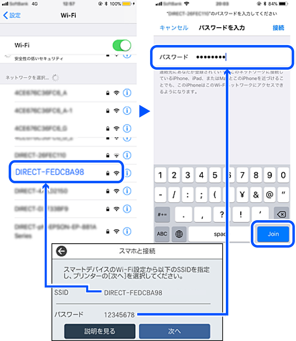 スマートデバイスのWi-Fi接続画面を表示し、プリンターの操作パネルに表示されたSSIDを選択して、パスワードを入力します。