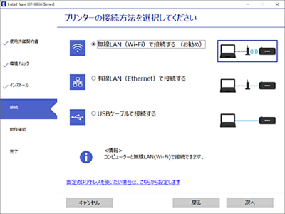 [無線LAN(Wi-Fi)で接続する]または[有線LAN(Ethernet)で接続する]から使用する接続方法を選択して、[次へ]をクリックします。